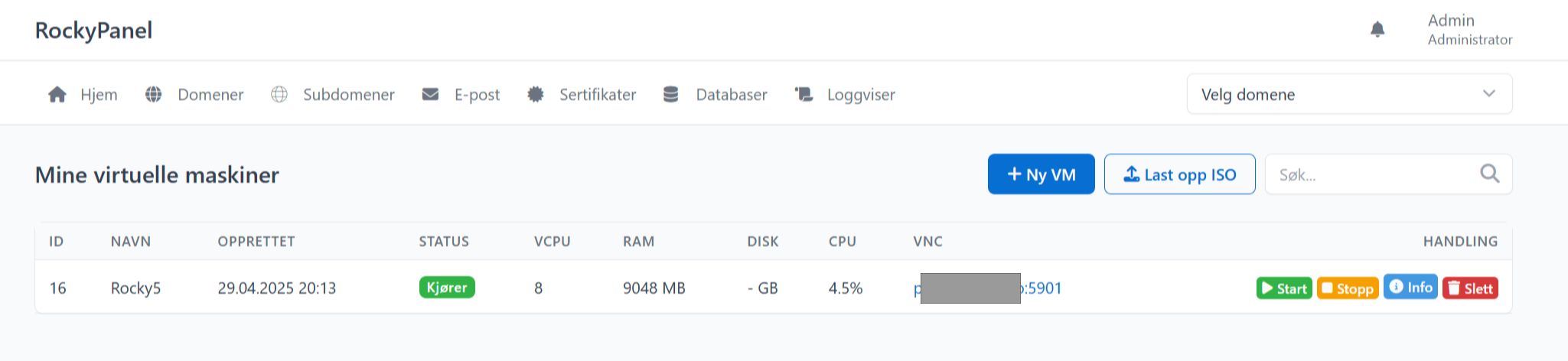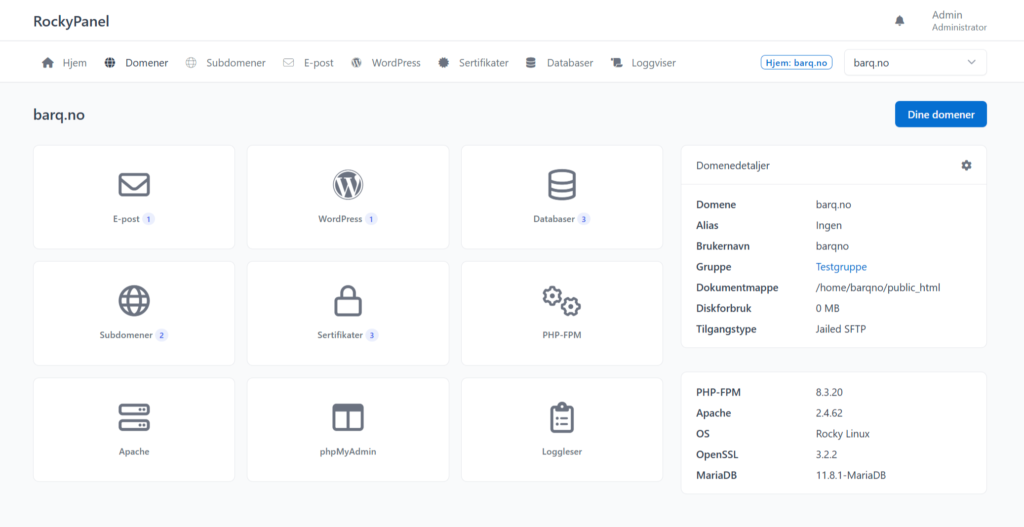Dette er lokale hovedsiden til et domene/konto (vhost) på serveren, som gir rask overblikk. Som serveradmin kan du også se alle domener på server og rask switche mellom domener fra listen oppe til høyre, men straks du velger et domene, så får du «vanlig» bruker sitt kontrollpanel.