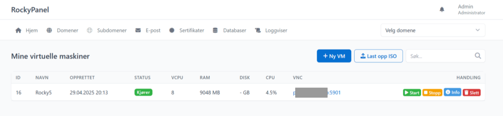 Dette er ment for nye servere eller kunder som flytter til nyere OS. Installasjonen må gjøres av oss foreløpig. Vi installerer siste Rocky Linux og med siste versjoner av alt. Så laster vi opp kontrollpanelet til din server og gir rettigheter til vår lokale agent som vi har låst ned så godt som mulig og kun godtar forhåndsdefinert input.