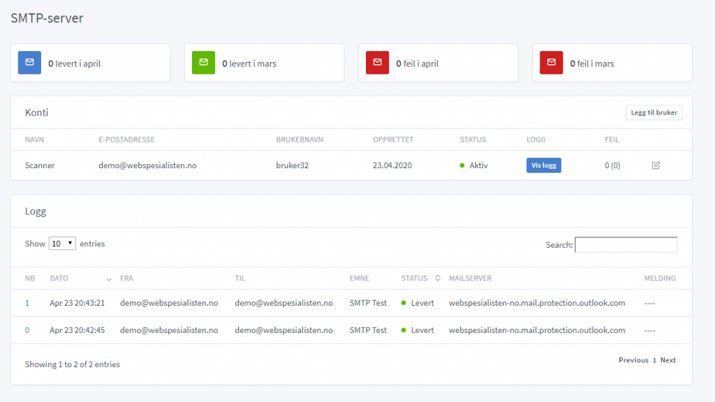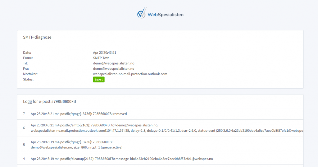 Ved utsending av e-post fra ulike applikasjoner er det greit å vite at denne faktisk kommer frem til mottaker. Ofte benytter man SMTP-serveren til Internettleverandøren (isp) til bedriften – eller en vanlig e-postkonto. En gjenganger er kunder som bruker Microsoft/Office 365 for å sende ut via en dedikert konto der.