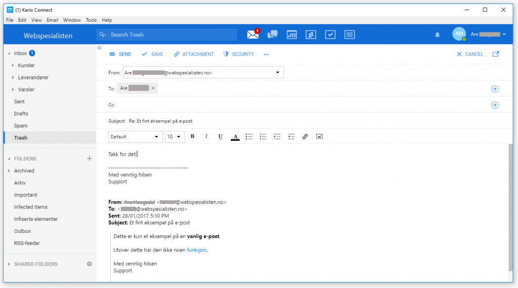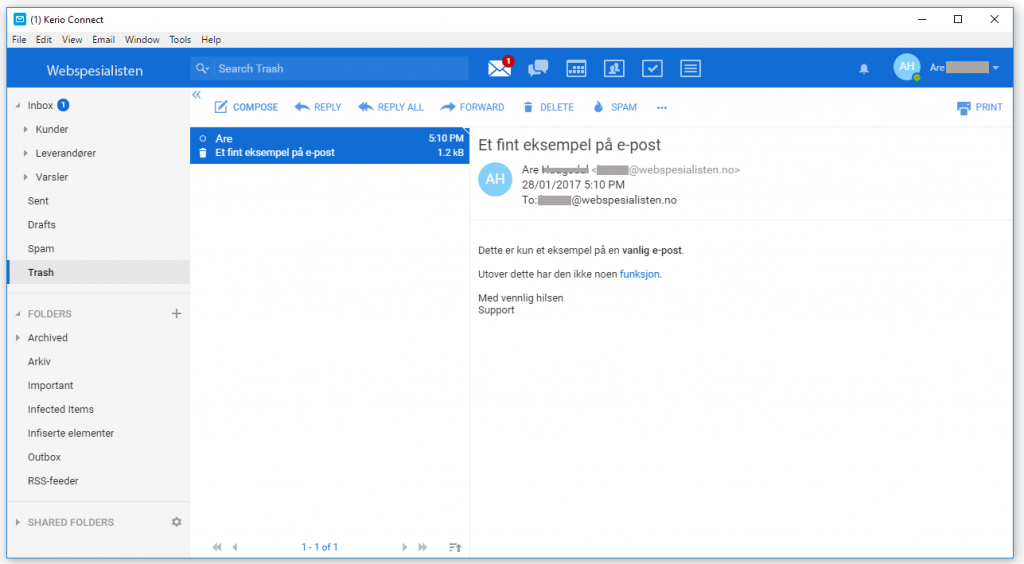 Kerio har også en gratis valgfri e-postklient du kan bruke som fungerer veldig bra og etter vår vurdering raskere og enklere enn Outlook. Denne ser du under og er nokså lik nettleser-utganven: