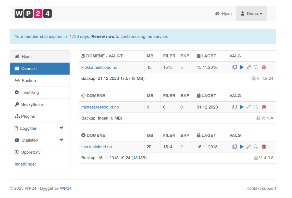 Gjennom vår egenutviklede tjeneste vi har valgt å kalle WP24 (WordPress 24), kan du finne ditt nye hjem for WordPress. I tillegg til å ha ditt vanlige WordPress-nettsted der, kan du lage så mange kloner du ønsker til enten underdomener eller nytt domene.